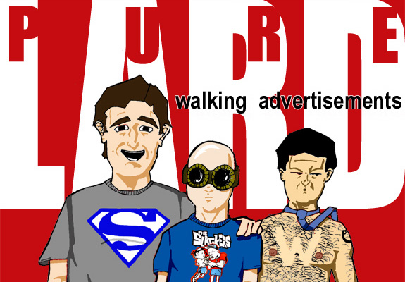 Hey, I'm not advocating or condoning being a walking advertisement. I don't believe I'm qualified to advocate or condone anything. But if I can get someone to ask me about my Madman Comics shirt, or, heaven forbid, my "Pure Lard" shirt, I can either find a kindred spirit, or turn someone on to something I like. Entrap them in my web of goodtime geekiness. Sure, I'll be a living ad for shit I like. Helps the shit I like. Helps me find other like-minded people. Covers my womanly chest. Good for everybody.