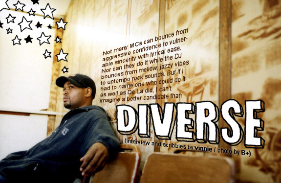 D: Word! And I think that’s something that’s really important to me, too. I mean, in terms of hip-hop shit, I grew up listening to Posdnuos and Dave from De La Soul. They were my favorites. The reason why you still listen to Buhloone Mind State and De La Soul Is Dead is you still learn something new, to this day. I forget what it was exactly, but there’s one line Posdnuos said on Buhloone Mind State,.. shit! It was just a couple months ago that I actually realized what he was saying! I think that that’s all I can ask,.. that people do that with my shit. I’m not a face value MC. When you hear me the first time, you might not hear everything that I’m trying to accomplish with my words.