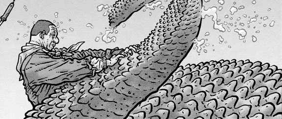 The biggest draw to Darrow’s work is his insane (and I mean nearly psychotic) attention to detail. Think Where’s Waldo? (unfortunately, Darrow hates the Waldo reference) meets M.C. Escher. When I first saw his work I had assumed he had previously been a technical illustrator, not an animator. Hopefully, these sample illustrations will titillate you into seeking his work out for yourself. You can purchase both Hard Boiled and Big Guy and Rusty at your local comic shop (or possibly check them out from your local library). Shaolin Cowboy is on sale now at comic shops everywhere, and is also available through burlymanentertainment.com. It’s currently on issue #5, so if you’re not into catching up, I’d have to assume that a collected trade is soon on the horizon. But don’t quote me on that.