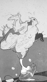 What stands at 4' 9" and has a penchant for monkey cocks and asses? No, not a primordial dwarf in a Linda Lovelace movie. It's Tara Espinoza! She's a little newt of a printmaker, but don't let her diminutive size and giggly manner fool you. There's a lot more than Barney Goes To Cambodia going on in Tara's creative mind and artwork. Ms. Espinoza's recent body of work could be described as playful. Yeah, playful in that "Is that Fievel The Mouse wearing a strap-on?" kinda way. The world Tara creates on paper is filled with cute cartoon rabbits, chickens, dogs and such doing very nasty things. Her work ranges from images like The Incident With Pink Soap (where a fully cooked, headless chicken is slipping on a bar of soap) to Consequences With Pink Soap (where the chicken is mid-tumble with the soap wedged firmly in its deep-fried ass). The work goes on that way, making you say, "Awwww," and "Oh fuck!" all in the same breath. I don't even have the words to describe my favorite print of hers, The Assassination. The only way I can sum it up is: bunnies in high-heels anally probing a beheaded donkey. Tara explained to me in seven words or less that her work is about process. She elaborated and compared its subject matter to the process of life: "We live, we eat, we poop, we have sex (if we're lucky), and then we die." How true.