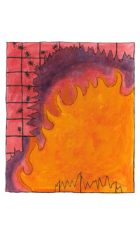"He stood across the street laughing. He watched it burn, all Halloween orange and chimney red."