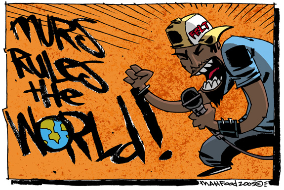 MURS: MAKIN' UNDERGROUND RAW SHIT. THAT'S WHAT THE MAN'S NAME STANDS FOR. AND THE MAN IS ONE OF THE DOPEST RAPPERS ON THE PLANET. IF YOU DON'T BELIEVE ME, SHUFFLE YOUR FAT ASS TO YOUR LOCAL RECORD STORE AND PICK UP ANY ONE OF HIS INCREDIBLE PROJECTS. NOBODY DOES IT QUITE LIKE HIM. UNDERGROUND CARTOONIST JIM MAHFOOD CONVINCED THE MAN TO MEET HIM IN HOLLYWOOD TO CHECK OUT THE NEW GOODS AT MELTDOWN COMICS. AND AFTER SOME GEEKING OUT AND LUNCH AT SUNSET THAI, THE TWO NERDS SETTLED DOWN IN MAHFOOD'S STUDIO FOR THE FOLLOWING CHAT.