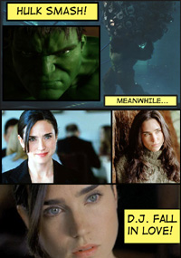 But none of that's important. Know why? Jennifer Connelly. Yep. She's in Hulk as the obligatory love interest. (sigh) Damn. Her eyes! Her face! Her voice! It's not about naughty boobies and adolescent boy shit. She's not sexy in a generic, fake tatties way, so much as she is,.. beautiful. I just-- every time the movie seemed to go on too long (like this pseudo-review) or apologize for its comic book roots with needless over-explanation one minute, and then mistakenly revel in them with dialogue that'd never appear in a comic today, she'd appear on screen. Then, everything was fine. I could watch her read a phonebook and be mesmerized. If she ever guest starred on that awful Ted Danson show, Becker, I'd even consider watching.