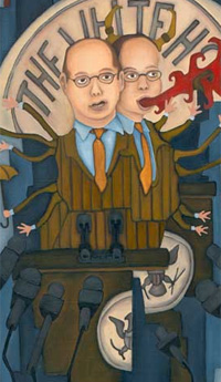 K: Well, in my last semester I got into doing more political commentary stuff. And I didn’t think I’d like it at first, because I didn’t think it really went with my style. But I’ve done a portrait of Bush, and another one of Ari Fleischer. And those turned out really well, I think.