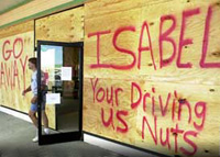 BISMARK, NORTH DAKOTA - While more than 100,000 people were being urged to evacuate the North Carolina coast in the face of Hurricane Isabel, those choosing to remain behind boarded up the windows to their homes and businesses with sheets of plywood and, in some cases, painted crude messages on the surface of the wood, in the feeble hopes of discouraging the storm.