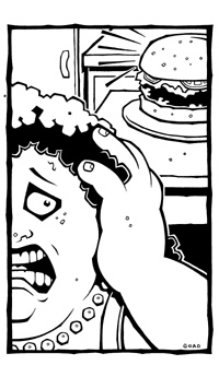 Hey, lard-ass! Yeah, you. Why on Earth are you ordering that low-fat, prissy little anorexic-special vegan salad when you know a chunky monkey like yourself needs to be wolfing down a real meal? Namely, me-- your good ol' charbroiled buddy, Mr. Triple Cheeseburger. Now, I know you're probably thinking about all my other names, like Captain Cardiac or Artery Aloysius. But I'm here to dispel all those misnomers and lay claim to my rightful title. I am, after all, the King Of All Lethal Food Combinations. That's right. Just one look should be enough to answer all your questions. Just one lusty gaze betwixt my sensuous, soggy, sesame seed buns should affirm your wildest desires. Sure, you can keep lying to yourself and eat nothing but shrubs and hummus. Or you can set yourself free with one bite out of my 6.3 pounds of processed bovine goodness. Don't stop at one bite, though. If you want to get with this, you've got to be willing to go all the way. From your first cross-sectioned taste of cheese and meat to that final, gorged intake of greasy, ketchup stained bun, I can't wait to get inside you and work my magic. So why keep hiding behind that bullshit diet when you could easily be eating the way God intended? My 87 grams of saturated fat, 50 milligrams of cholesterol, 219 milligrams of sodium, 10 grams of sugar and total lack of vitamins B, C and E will be the best thing that ever happened to you. I promise.