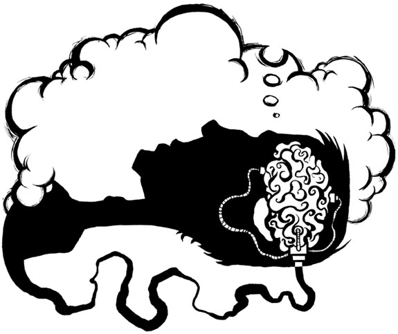 I was jolted from slumber by the angry klaxon of my alarm clock. After first rewarding myself with a big cat stretch, I unplugged a tiny silver spike from the back of my head; a black cloth cable at one end spilled down to the floor, and snaked across the room before climbing the scarred wooden legs of a cluttered workbench, where it was lost in a bird's nest of transistors, antiquated vacuum tubes, '50s era voltage regulators, and an over-clocked CPU awash in a wild show of blinking lights and exposed cables, one of which fed into the side of a battered electric typewriter I recently acquired at a fire sale.