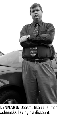 "They're giving these schmucks my discount," stated Derrick Lennard, a Ford salesman of seven years. "You know, some would consider an employee discount a fringe benefit of having a job. But I guess not."
