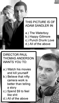 Let me congratulate you on your film, Punch-Drunk Love. It is truly an astounding achievement in the tradition of your other films, Magnolia and Boogie Nights. The dizzying camera work, coupled with the abstract soundtrack and unique storytelling techniques, really allowed me to experience the disorienting and disconcerting mind of Adam Sandler's character, Barry Egan.