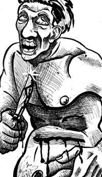 Kyle slammed his eyes shut hard and ran a finger across the gaping slash that ran through his stomach. "Damn, that hurts," he said to no one in particular. Apparently, a butter knife is simply just too dull to properly slice off excess love handles.
