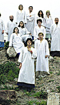 The Polyphonic Spree (TPS) on disc sounds like Roger Water's-era Pink Floyd in a bus wreck with Sgt. Pepper's-era Beatles. A self-proclaimed "choral symphonic pop band", TPS weaves sprawling landscapes of voices with psychedelic swirls of French horn and guitar. The reality of the band is far more terrifying: TPS is a group of 23+ band/cult members who all dress in long white robes, don't title their songs, and are released by Good Records ("a division of the Good Umbrella", whatever that is). Former Tripping Daisy frontman, Tim DeLaughter, (who is credited with "arm waving" in the liner notes) presides over TPS like a musical David Koresh. The press photos show them standing together releasing balloons into the air, smiling on a hilltop, and standing in the woods like a bad 1970's John Denver album cover. There is such a positive feeling to the music that it genuinely creeps me the fuck out! I imagine myself trapped in an old revival church with these bastards overflowing the stage, asking me to drink the "Kool-Aid". Like the aunt who was "born again" and can't blink or stop grinning at you from across the dinner table, this band will scare you! The music is compelling and trippy, but I can't say that you should own the disc. I can't take that responsibility. I honestly don't know what it would do to you. I think this band is dangerous! I swear I'm hearing subliminal messages! Where did this tambourine come from? Whose voice is that? One of us. One of us. One of us. One of us. One of us. One of us. One of us. One of us. One of us. One of us. One of us. One of us. One of us. One of us.