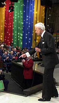 Fast-forward to a little later. Henrietta has won a red convertible for her 50th wedding anniversary, and now she’s ready to spin the big wheel with Jim Breuer and frat boy. Usually, when a contestant doesn’t get the wheel all the way around, the audience boos him. Poor frail Henrietta didn’t get it all the way around. In fact, I’m surprised she didn’t break a hip in the process. But the audience doesn’t boo her-- they rally! They start shouting, "That’s okay, Henrietta!" Even Bob Barker doesn’t chastise her. He helps her spin the wheel again, and it lands on $1. I thought she was going to drop dead from excitement, but she’s okay. They show another shot of her husband waving his hook with pride.