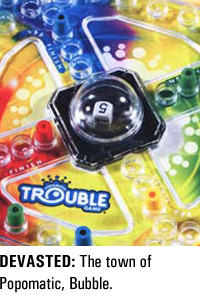 POPOMATIC, BUBBLE - Citizens of Popomatic were shocked and fear-stricken earlier this week when trouble came crashing through their peaceful town in the form of a giant die. There were no survivors.