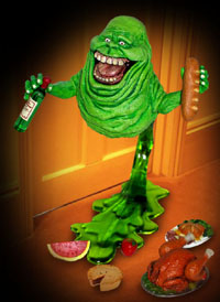 It is really hard to pick a favorite in this collection. Slimer probably inches his way to the top with his numerous accessories and really sweet display stand. He comes with a whole turkey with removable legs, a pie, a plate of luncheon meat, a loaf of French bread, an apple, a big slice of watermelon and a bottle of Chateau Venkman, vintage 1984. That’s a lot of great stuff to lose! The stand is the topper though. It’s basically a large transparent green slime trail that pools on the ground and plugs into his buttocks. Pretty clever.