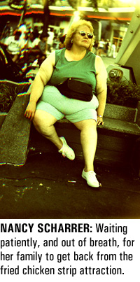 "This is our fourth day at the Magic Kingdom," stated mother Nancy Scharrer, 37, from her wheeled fatty-fatso cart. "We hope to have this park done by noon tomorrow. And then it's on to the restaurants at Epcot."
