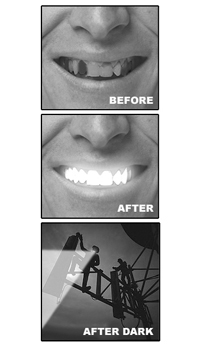 I just wanted to write a brief letter to thank you for the miraculous changes in my life, due in no small part to your amazing Rapid White teeth cleaning system. As a construction worker, I needed to have the brilliant, white smile that people would expect of those in my profession. You can see in the attached pictures that my teeth were in less than stellar shape from years of chewing on roof shingles and road tar on the job. My co-workers, especially Lenny "The Humper" Wilson (don't ask), my foreman, would ridicule me endlessly. Then I found Rapid White.