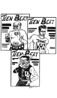 Not soon after, I saw Jay and Willy walk in. They looked around for me, so I waved my hand. They smiled and came over to the table. But instead of sitting down, they frowned. Oh no! I've been found out! They know I'm not James Van Der Beek! Then Jay flipped out a Teen Beat from his pocket and threw it on the table.