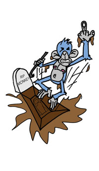 There is neither a funnier nor friendlier living animal than the free and silly monkey, all inquisitive and full of life. But once a monkey is cut loose from the mortal coil, all that goes down the shitter, my friend. A sick and twisted, angry and violent creature emerges once the specter of death takes a monkey from life. Gone is that lovable, curious monkey. It is replaced by a mean motherfucker that wants nothing more than to use its opposable thumb to grasp a big ol' crowbar and start some shit-- mainly with humans, because we think we're better than them! Putting them in zoos and shit! Making them dress up in funny clown costumes and juggle! Sending them in space because we're too pussy to try it first!